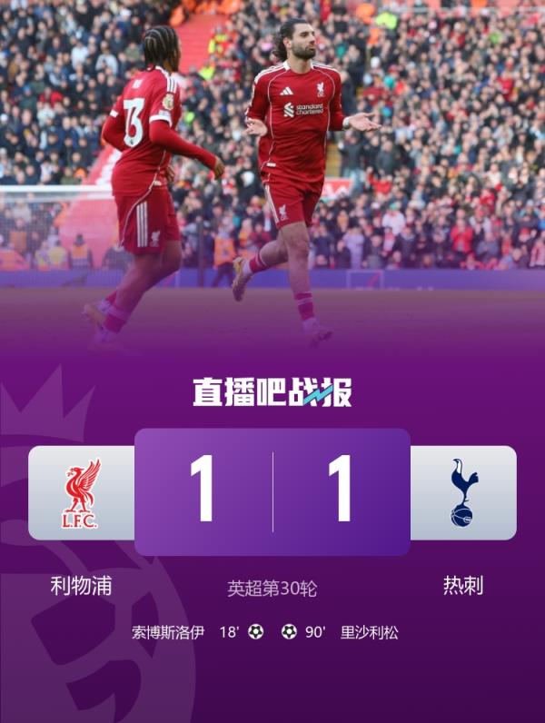 利物浦升至第五,热刺结束各项赛事6连败,领先降级区1分;索博任意球破门,里沙利松绝平。