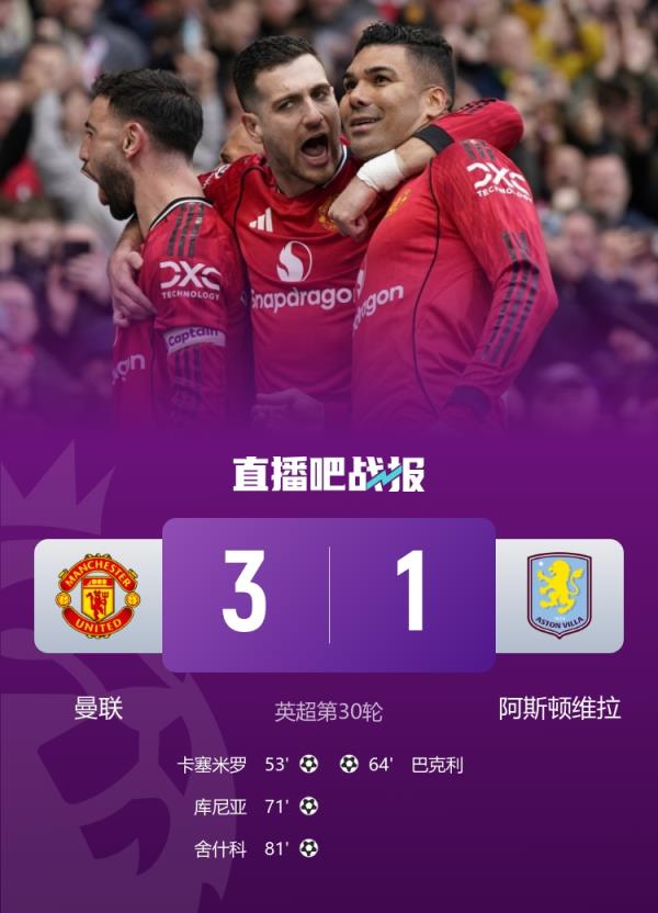 曼联3-1维拉 B费助攻双响破小贝纪录 卡塞米罗库尼亚舍什科破门