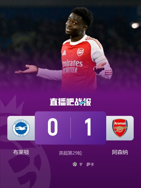 此轮战罢,阿森纳以多赛一场、领先7分的优势强势领跑积分榜,争冠形势一片大好。反观曼城,手握控球和射门优势却迟迟无法终结比赛,到手的三分变一分,使得自己与榜首阿森纳的差距拉大。